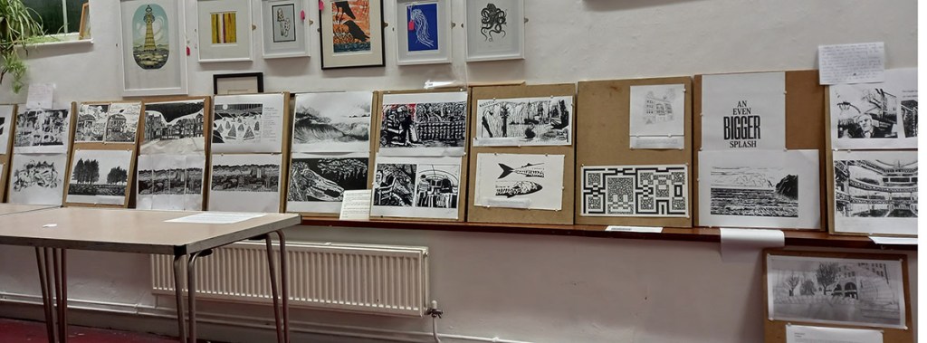 It’s 25years since Swansea Print Workshop began! To celebrate, we’re doing a load of special things throughout the year. I’ve recently been working on a new Mari Lwyd linocut and it’s my submission to an artists book we’re creating – 25 artists for 25 years. The theme is very loose, “Swansea”, and each print will be black and white, either relief- or screen- print and the whole set will be bound into concertina books, one for each artist and two for the print workshop. Tonight we met up to look at the first proofs, there’s a lot of lovely stuff there and I can’t wait to get my book.