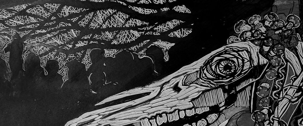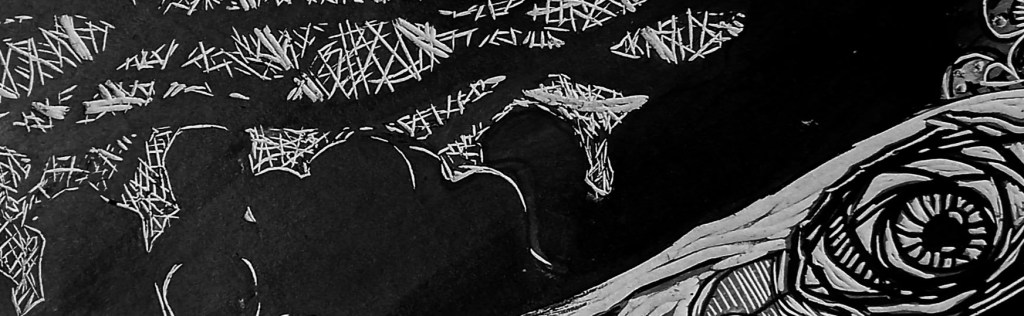 I’ve more or less finished carving the head of the Mari Lwyd in the foreground so today I gave some attention to the background. I wanted some detail in it, but not enough to compete with the Mari Lwyd. I wanted to have some light showing in the background but I didn’t want a solid white, I wanted to retain the sense of darkness, as this is based on some sketches I did at night at the Gower Wassail and Mari Lwyd celebration at Hen Galan.