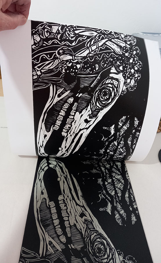 My inspiration is the Welsh tradition of the Mari Lwyd. Husb and I made our own during the Covid pandemic lockdown (from a kit designed by David Pitt for TRAC) and we have taken her out a couple of times a year since for local celebrations. She’s the model for this linocut.