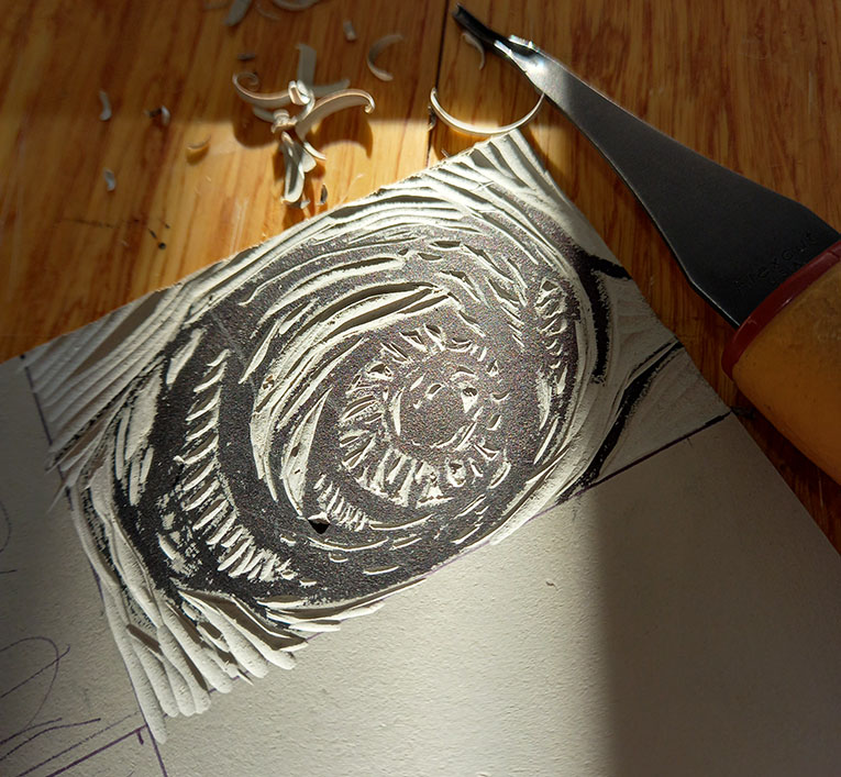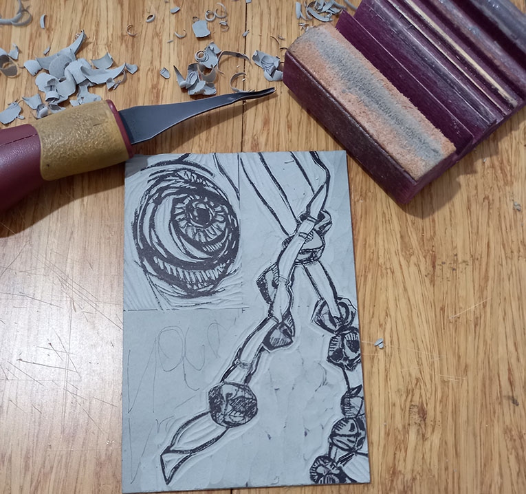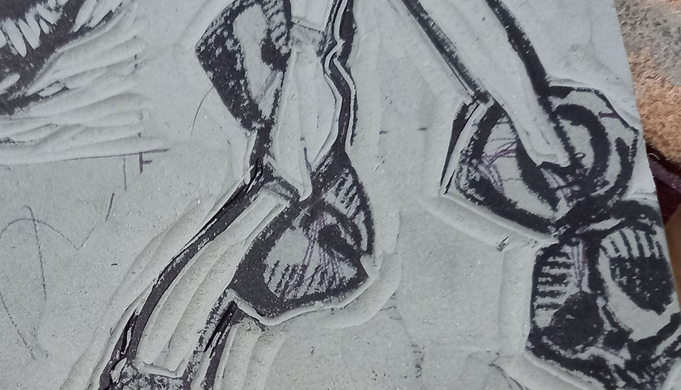 I’m using Flexcut tools kept sharp with a Slip Strop into traditional grey hessian-backed lino. I drew directly onto the lino with a Faber Castell Pitt drawing pen, working from a photo of my own Mari Lwyd.