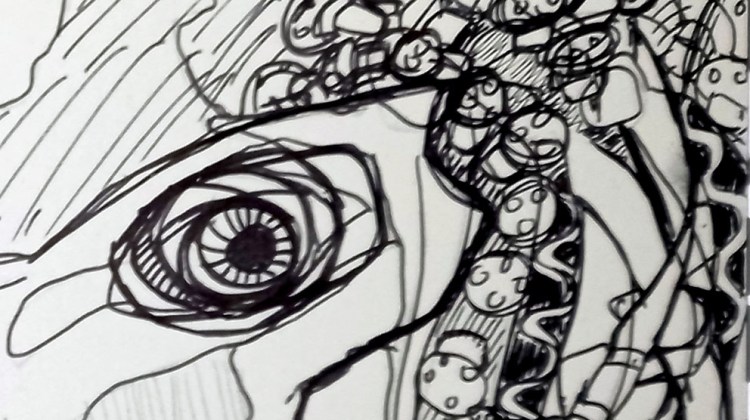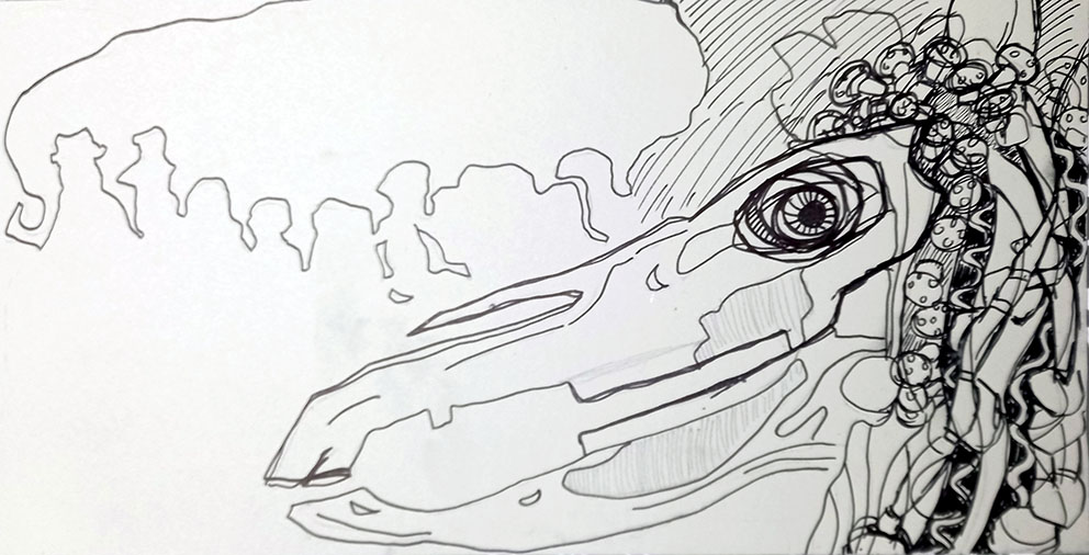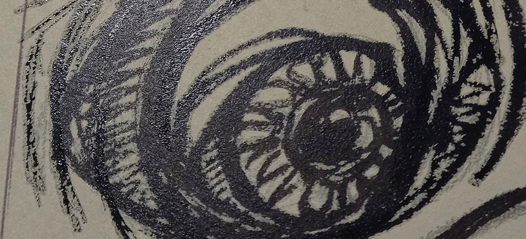 I traced my Mari Lwyd sketch onto tracing paper today, flipped it over and drew it onto my lino block, like we used to do with maps back in my schooldays, when dinosaurs roamed the Earth. It’s a very basic outline, I’ve got to do some studies of the bells and ribbons, flowers and eyeballs before I start cutting.