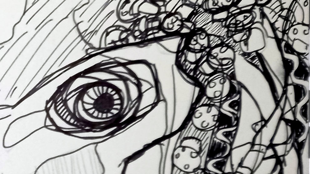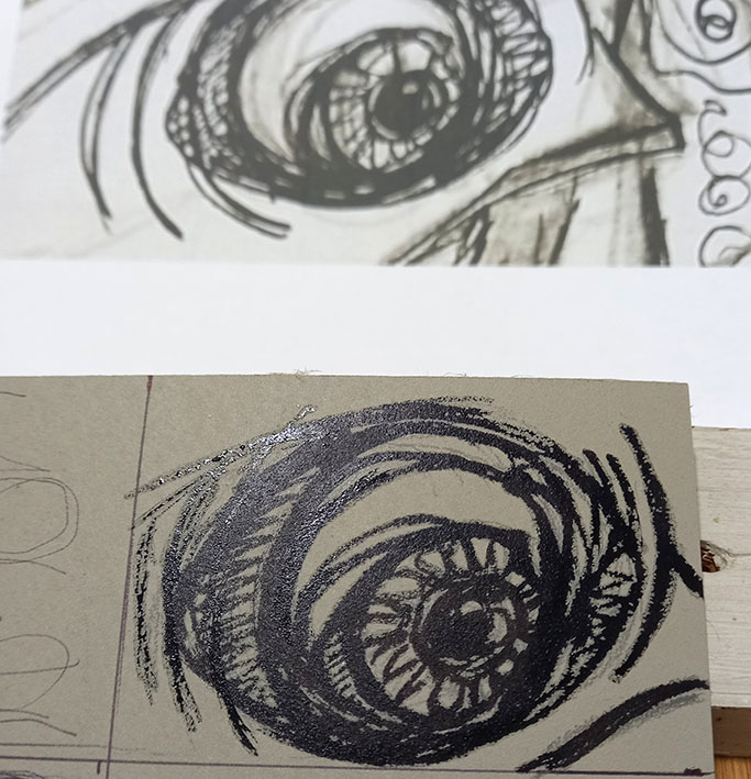 Over the past few days I’ve been carving details of my new Mari Lwyd linocut design into a small piece of lino to see how they work out, so now I’ve started drawing details onto my full size block. There’s a way to go yet though before I start carving…