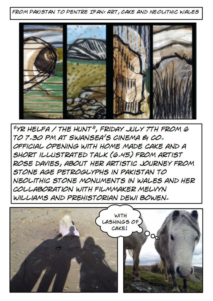 My solo show, “Yr Helfa / The Hunt”, is now on at Swansea’s quirky artspace, Cinema & Co throughout July and we’re finishing with a fabulous event on Monday July 31st from 5.30 pm featuring a film from Melvyn Williams, an illustrated talk from Dewi Bowen and I’ll be launching a new edition of a lino print made especially for the event.