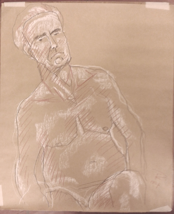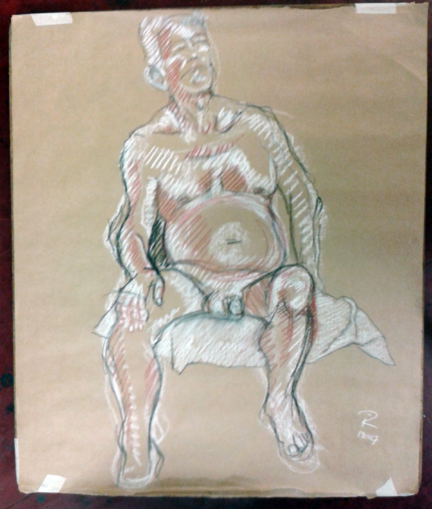 The first of my life drawings last week at Swansea Print Workshop. I like working with this older male model, his face and body are interesting and he’s a very experienced model. This was a relatively quick sketch using white, sanguine and black conté crayons onto brown parcel wrapping paper.