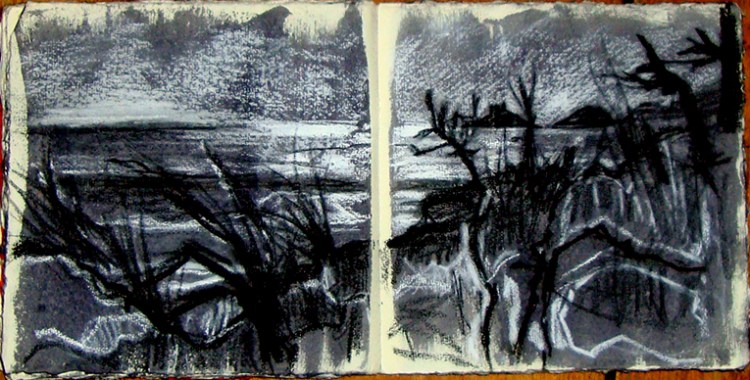 Back in November 2012, Husb and I were lucky enough to visit the wonderful country of Iceland, the original Land of Ice and Fire. The landscape was unlike anything I’ve ever seen, brutal with beautiful colours. It was freezing cold and drawing was a challenge, not only for my fingers but also my drawing materials – my pens wouldn’t work and it was too cold to get my watercolours out. I settled on compressed charcoal, soft pastels and ink. I drew into my Khadi handmade paper square sketchbook, often using both sides for the same scene.