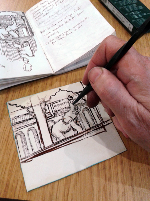 I started working on a new tiny drypoint. During my residency in Pakistan last year, I did a fair bit of sketchbook drawings and I spotted this carved elephant in a restaurant in Lahore. I scribbled it and I’ve now redrawn it, with a Faber Castell Pitt drawing pen, onto a small piece of drypoint card (available from Intaglio Printmakers).
