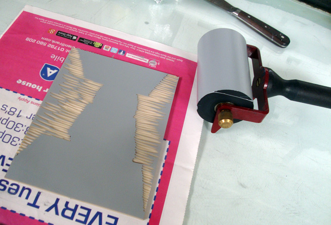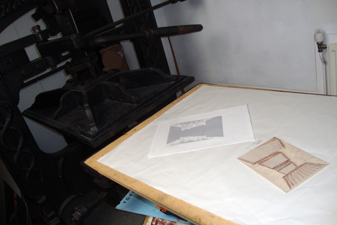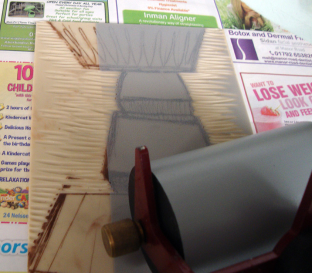 I’ve spent two days working with the 15 Hundred Lives art collective in the Creative Bubble artspace, giving the public open access to our working processes and at the same time putting the finishing touches to the last pieces of work for our upcoming exhibition at Oriel Ceri Richards. Here I’m drawing onto vintage paper that I’d prepared by squeegeeing black and gold acrylic screen print inks straight onto the paper, to break up the tyranny of the white. I’m working onto it with chalk, compressed charcoal and white conte crayon. I’ve broken away from my usual practise of working directly from life, drawing instead from my imagination. The imagery that’s emerging has been influenced by some visits I made about three years ago to Berlin and Iceland, but more of that later. Now to bed. I’m shattered!