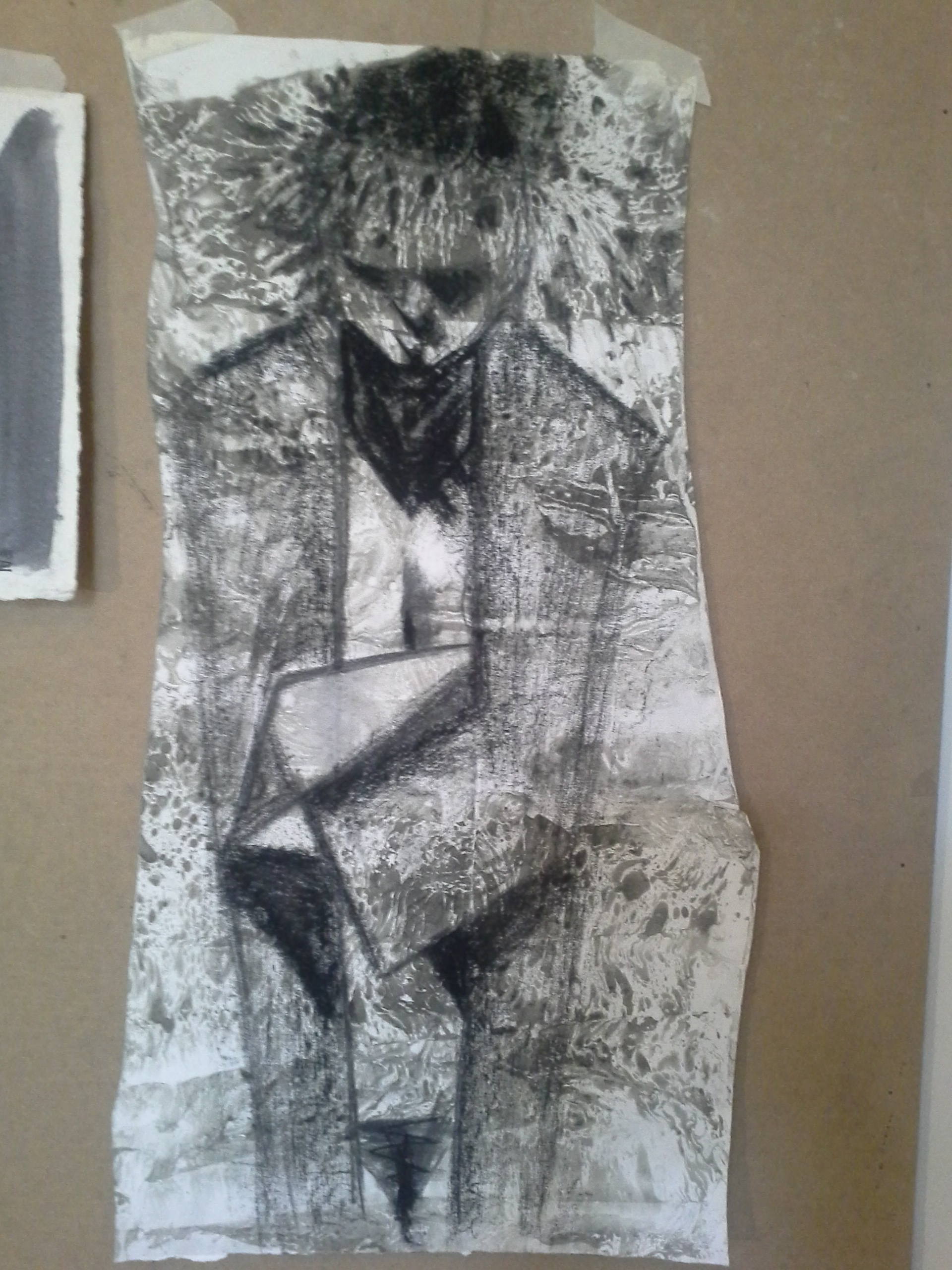 I’ve been working on a series of silkscreen prints over the past few weeks, tight design and a very specific technical process and I wanted to get back to something intuitive, so I grabbed my marbled paper and various black drawing media: some willow charcoal, carbon, compressed charcoal and Bideford Black. And I got stuck in. I used an old life drawing very loosely as a basis and then got into the zone, moving the media across the paper, just letting it happen.