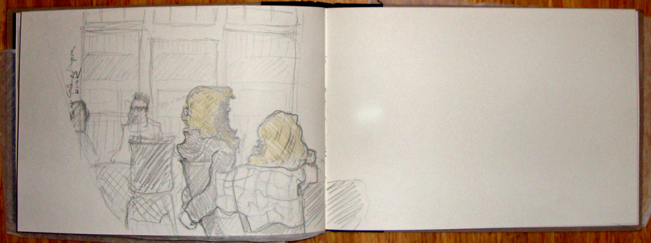 Never one to miss the opportunity for a quick scribble, I sketched a few of the people in the lovingly restored interior of this old building which was for many years a bespoke corsetry shop called Madame Foners. One of the girls I drew had her arms grasped firmly behind her back in a way that only the young can manage, my ageing bones would snap if I tried to manouver them into that position.