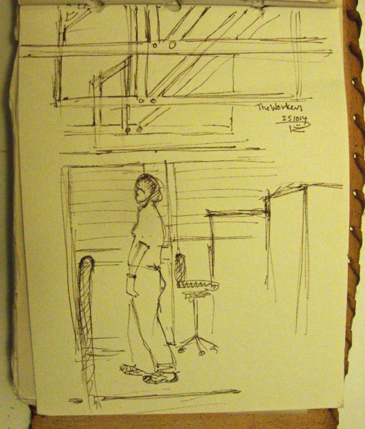 Went for a walk to Mumbles with Husb and the Little Nephew today. The weather was crazy, alternating between warm sunshine and gale force winds and driving rain. We found a greasy spoon caff and piled into traditional fried breakfasts. It was enough to carry me through the rest of the day. Won’t need anything until tomorrow’s breakfast now. I sketched heads around the cafe at random, just a couple of minutes on each. I used a Faber Castell Pitt drawing pen, size F into my A5 Steampunk leatherbound sketchbook.