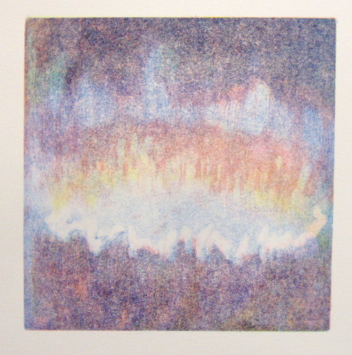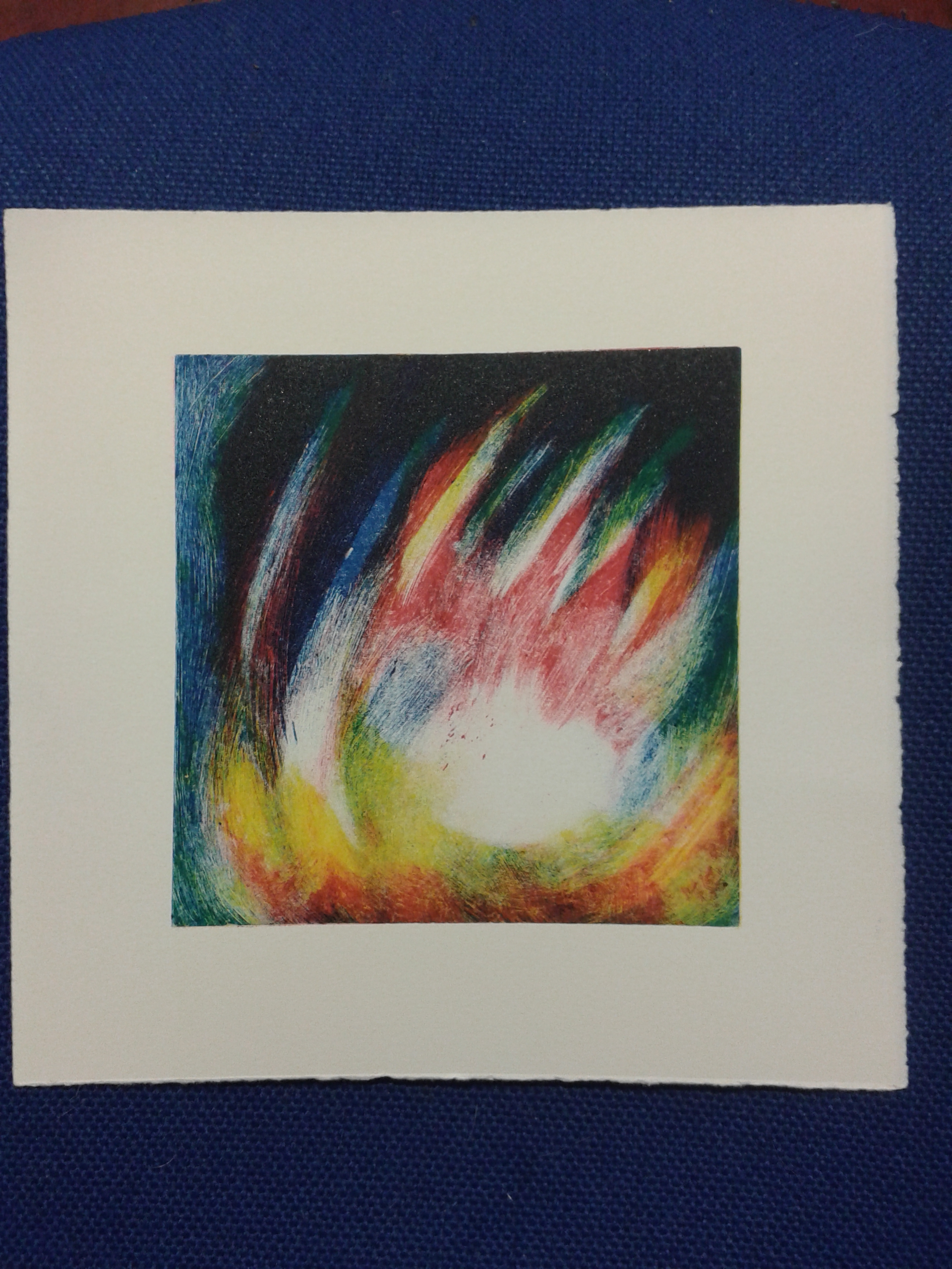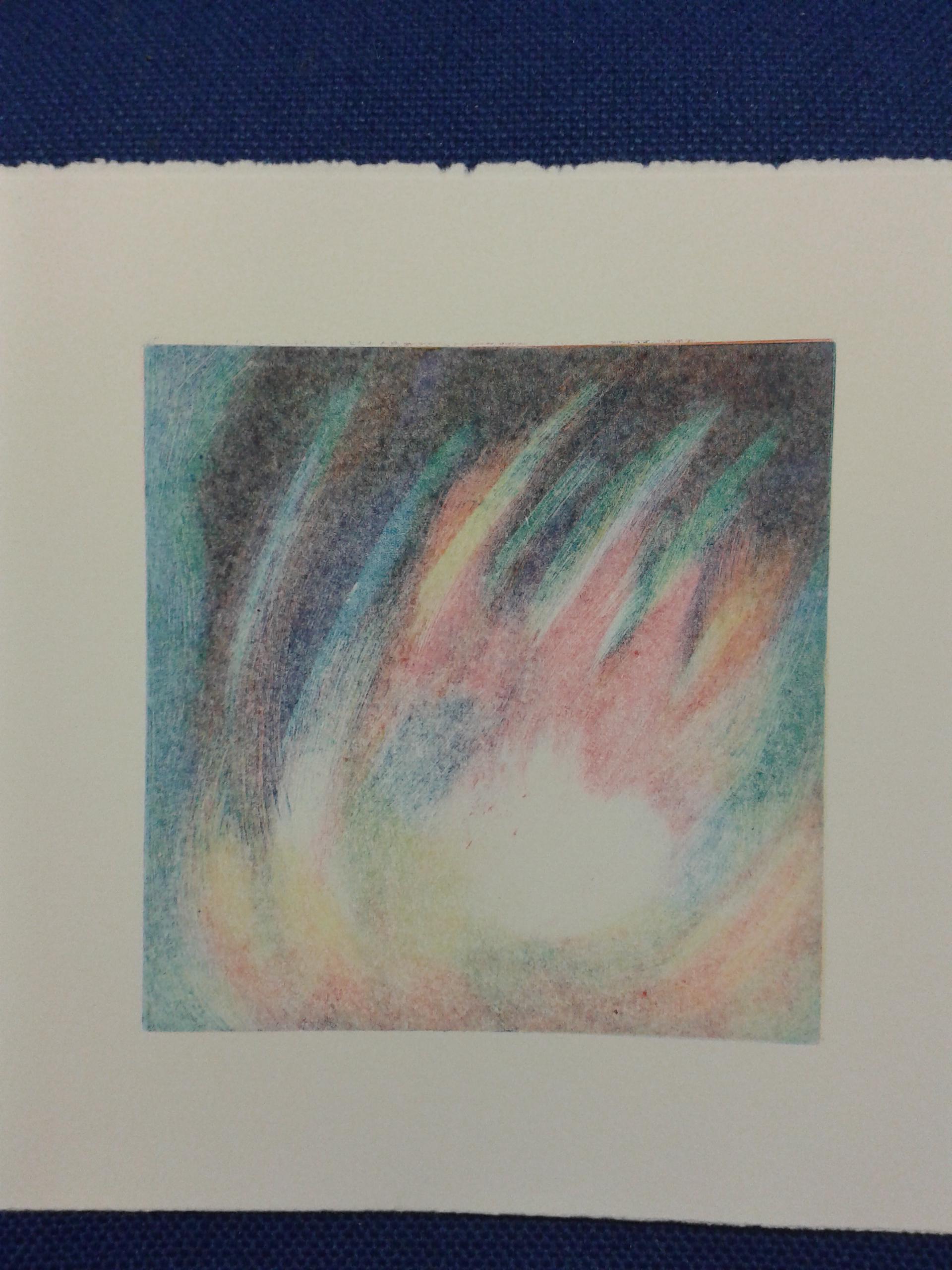 Spent a happy few hours at Swansea Print Workshop this evening, making another small monotype based on one of my pastel landscape drawings from the residency I did in Pakistan earlier this year. I did a series of 49 small drawings very quickly, so they are very impressionistic. This is based on one of the drawings done during a thunderstorm. This monotype technique is called stacking or reduction monotype and it produces a full-colour unique print. It’s where painting and printmaking cross over.