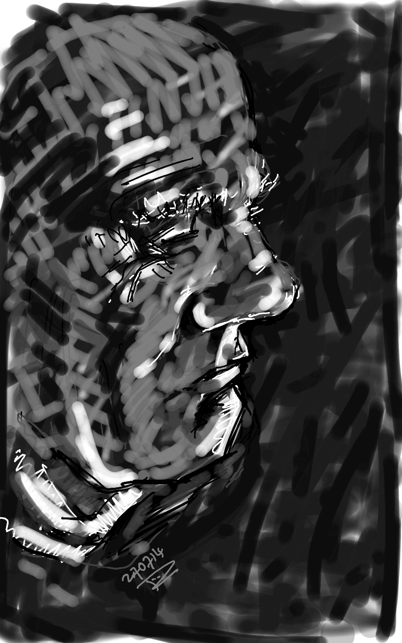Husb posed, with the light from his laptop creating strange shadows up his face, making him look weird. I used my Samsung Galaxy Tablet Note 8 with the free Markers app, laying down a dark background and working over it with lighter tones.