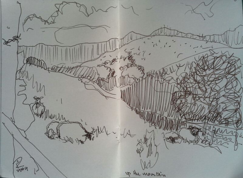 I had a quick scribble into my little A6 spotty sketchbook with a Faber Castell Pitt drawing pen size S. The landscape is so enormous it’s hard to know where to start and how to approach it, but the main thing is to focus on making marks and not try to get in too much detail. I think of van Gogh’s landscape drawings when I’m doing them.