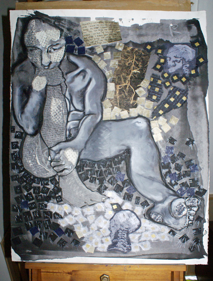 So I haven’t done a drawing today and I’m not going to because I’m too busy wallowing in viral misery. I did this mixed media piece a couple of years ago and I’m blogging it today because I’ve just submitted it for an exhibition that’s coming up in Swansea later this month. It’s called, “I Know ‘Ew Luvs Me Coz ‘Ew Buys Me Chips”, a well-known local saying. And now I’m going to wrap myself back up in a blanket and rail against the universe. 😦