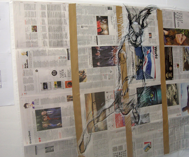 So here we are. We’ve just finished our 6th session over 6 months and it looks like we might be able to continue throughout the year. Lots of people wander in to look around and chat to us and artists are keen to come in and use the wall space. Graham Parker and this month’s guest artist, Patricia McKenna-Jones are in the top picture; Graham working on an abstract painting and Patricia on a drawn collage composed of drawings she’s made onto newspaper from her sketchbook studies. Then there’s Sylvie Evans, using the window space to construct a collage from left-over Xmas materials and I’m in the third picture working directly onto newspapers.