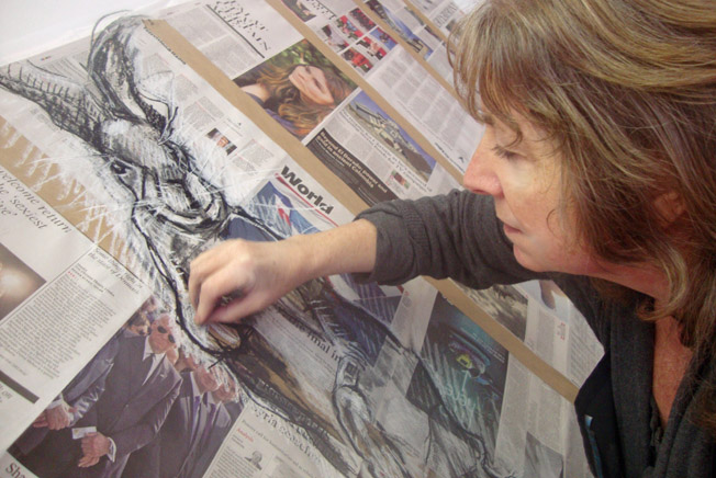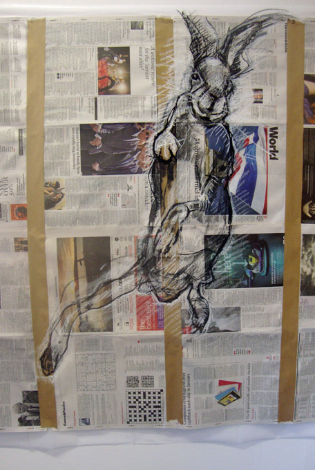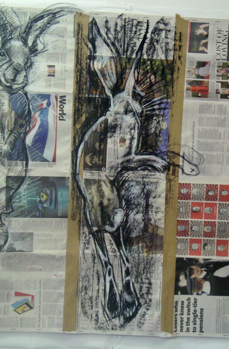 I also like drawing onto newspaper. The overall piece is about 10 feet long and maybe five feet high and I’ve enjoyed working on such a huge scale after spending several days drawing hares into a tiny sketchbook and into a Samsung Galaxy Tablet. It’s much more physical and my shoulders and neck are aching now. Back to a tiny sketchbook tomorrow, I think.