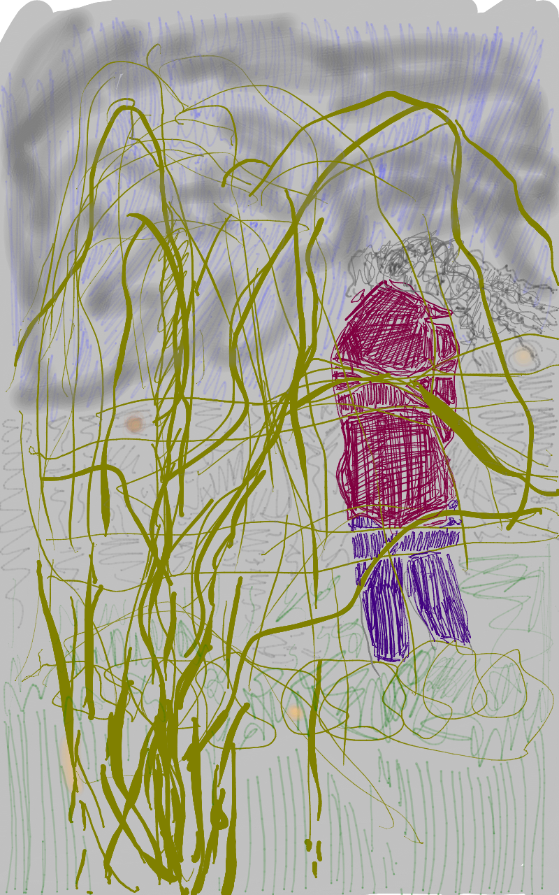 Scribbling on the hoof means that I have to be quicker than usual, so I did some very speedy sketches and carried on working into them when I got back inside. Here’s the first of them. I just added some scribbly colours and gave a bit more emphasis to the tree and the fencing in the foreground. I used a free Magic Marker app.