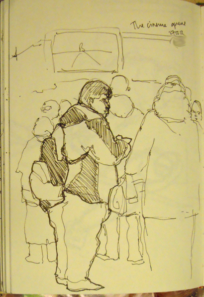 I had seconds to draw each figure which is just enough time to get a fleeting impression of form, movement and proportion before they’re up and off. Drawn into my cloth-bound A5 sketchbook with Faber Castell Pitt pens size F and M.