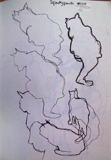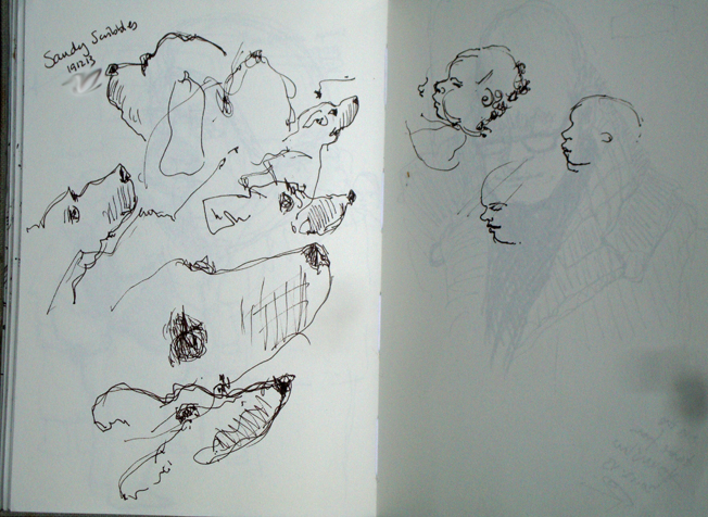 Today, Husb and I went to a family Xmas party which was overrun with sprogs and ankle-biters. I was put on tattoo duty, applying temporary tatts to tiny arms and faces but had a chance to scribble during lulls in demand for skin decor. The trouble with sprogs at a party is that they are hyped up to the max and stuffed full of sugar so there’s no chance that they’re going to be nice and still while I draw them.