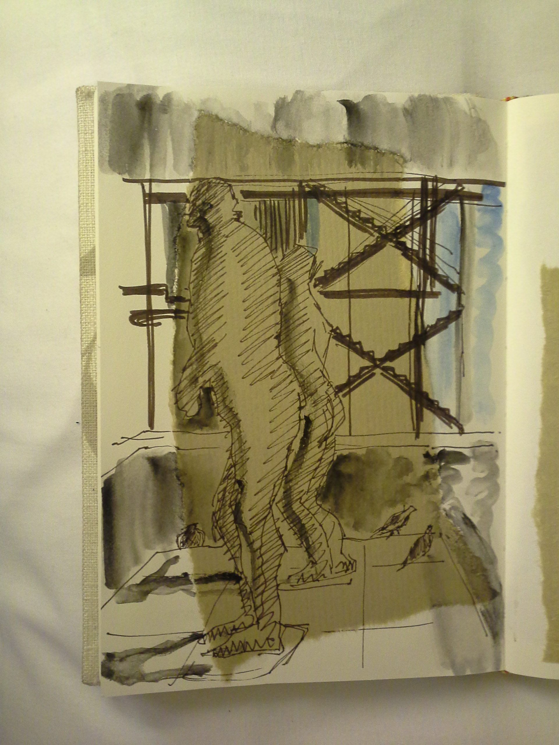 Drawn into my cloth bound sketchbook with Faber Castell Pitt Drawing pens and a touch of water colour. I prepared the sketchbook first by sticking in some brown parcel paper with a Pritt stick.