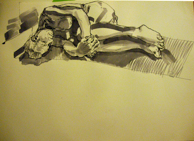 Does what it says on the tin. A man. On the floor. Just got back from life drawing group this evening, at Swansea Print Workshop, and had a terrific pose to draw, with difficult angles, perspective and foreshortening. Lovely. I’m a bit of a masochistic scribbler. The workshop has strong spotlights that give good chiaroscuro effects. I used a dip pen, Indian ink, a variety of sable brushes with ink wash into an A3 cartridge pad.