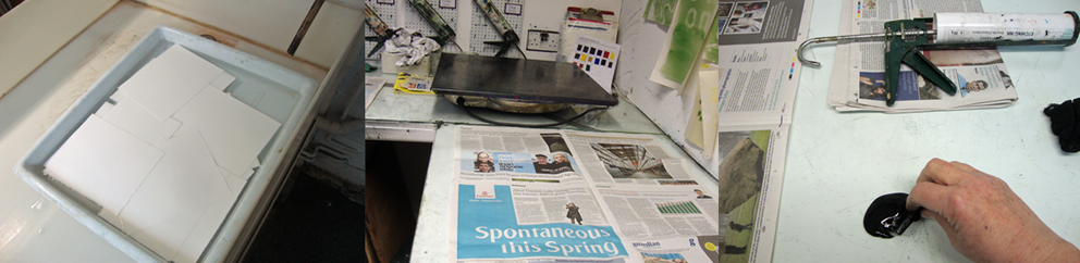 I spent the afternoon at Swansea Print Workshop, editioning a photopolymer intaglio plate. First I cut 15 pieces of BFK Rives 250gsm paper and put them to soak in clean water. I set up my workspace around the hotplate that I preheated and put some Intaglio Printmaker’s drypoint shop mix oil-based ink in black onto the glass work surface and mixed it a bit with a mini squeegee to get it nice and malleable.