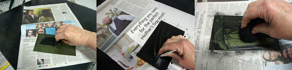 I spread the ink over the photopolymer plate that I’d put onto the hotplate (with newspaper to keep the hotplate clean). Once it was well covered, I removed excess ink with the edge of a piece of stiff card then took the photopolymer plate off the heat and onto the work surface to continue removing the ink with a piece of washed scrim.
