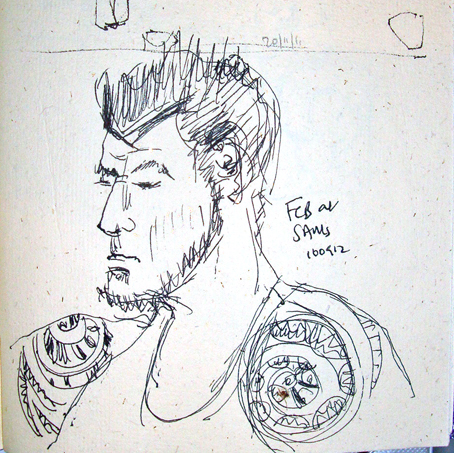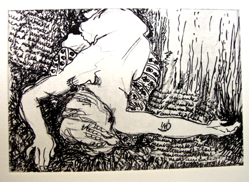 I’ve had five whole days away from the computer. The RSI problem came back with a vengeance and coupled with a nasty lurgi, I decided to take a bit of a break from t’Internet. I’ve still been busy in the studio though, developing some plans for a series of larger scale subtractive drawings. I stretched some sheets of Fabriano Accademica onto the studio wall and gave them two coats of acrylic gesso. I rubbed in compressed charcoal over the surface of two of the sheets and coated the third with graphite, smoothing it over with a rag dipped in turpentine. Then I transferred one of my life drawings to a smaller bit of charcoal-coated card to do a practice piece before committing myself to the larger paper. I like this technique very much; the resulting drawing is rather like a mezzotint.