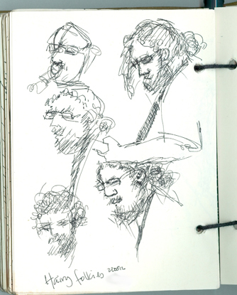 Went to see a fab band at The Garage the other night, The Peatbog Faeries, part of Husb’s birthday present. They’re sort of a fusion of Scottish folk/rock with trance/ambient undertones, overlaid with bagpipes. Fantastic. A get-up-and-bop-all-night band. I ached the next day! They were supported by a young local folk band, Thistledown. It’s good to see a new generation of young people making their own folk music. And it’s good for a scribbler to get to see lots of hairy faces! All in one place. They’re a bit of a pain to draw though 🙂