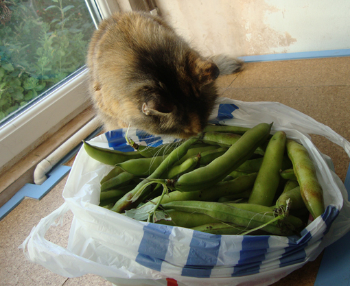 We’re cropping well from our allotment and here’s Little Ming doing a quality control inspection on our latest pick of broad beans. We’ve grown mainly Claudia Aquadulce that I planted last Autumn; I also tried Imperial Longpod and Red Epicure but they didn’t come to much. We pick the young leaves throughout the Spring because they make a delicious salad with the French sorrel and wild garlic that are in season at the same time and they’re also good in stir fries. I reckon we’ll get one more bag off the plants.