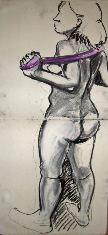 Tonight’s model is in her forties and has strong features and a powerful body. I love drawing her because she’s very fit and flexible and holds some terrific poses. I did three drawings of her tonight and this is my favourite, a thirty minute pose in conte and oil pastel into my Bockingford sketchbook. I like the foreshortening and the awkwardness of the left arm. It’s a pleasing composition and it’s definitely going to be reworked as a more complex drawing and then made into a large monotype.There’s a terrific twist going on, a sort of horizontal contrapposto.
