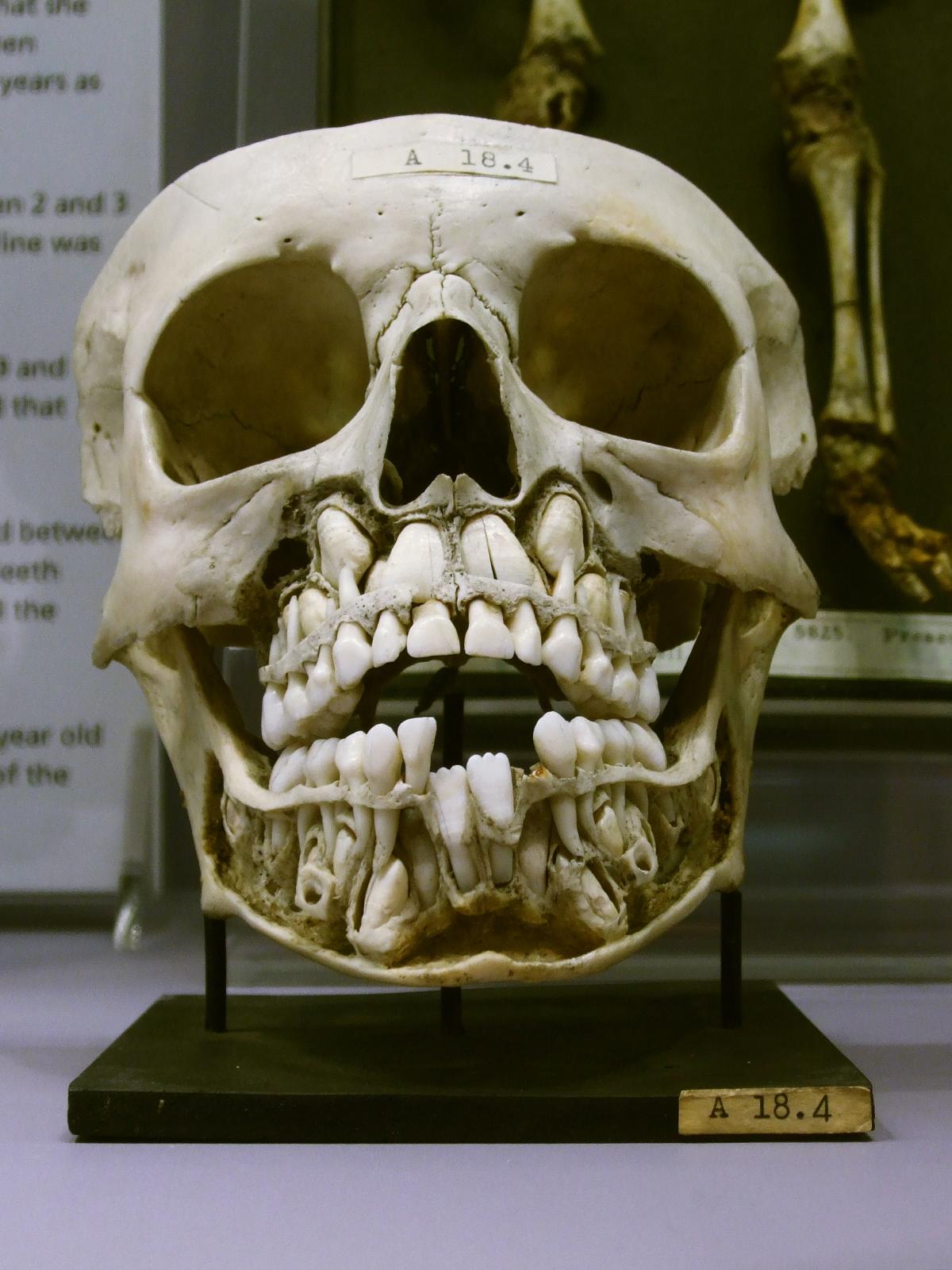 Here’s one of the life drawings I did last night. It was a 15 minute pose and there was a lot of tension in the body which was quite difficult to draw. I’ll definitely work on it some more; it has potential. I was pootling about on Facebook earlier and came across this example of a child’s skull, showing all the teeth – the visible milk teeth and all the ‘teeth-in-waiting’ – absolutely gruesome. No wonder they have such enormous heads! That’s why they’re so difficult to draw. It’s hideous and fascinating at the same time but I won’t be able to look children in the face and go ‘aaaahhhh’ any more because now I know they’re a cross between Alien and Predator under that cute little visage!