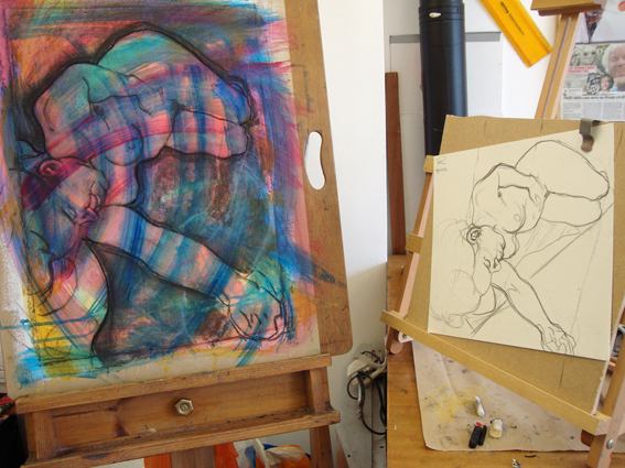 I spent ages trying to get it ‘right’ – it has to be drawn to fit the perspex matrix that I will use for the monotype, but in order to do that I had to do a certain amount of distorting, which I baulked at at first. By 10.30 I was pacing around the studio like Lady MacBeth declaiming ‘Why am I doing this? Why don’t I just stack shelves in Sainsburys?’ Then I dipped into Nigel Spivey’s most excellent book, How Art Made The World, as I remembered seeing something he wrote about how artists have always distored the human body, like Michaelangelo and Schiele, and that gave me a lot more confidence to loosen up and not worry about keeping to accurate proportions.