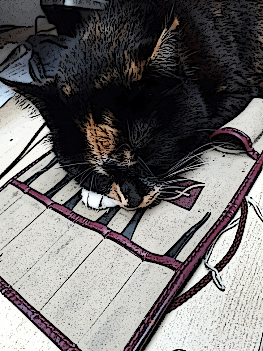 “Greetings Hoomins. Sparta Puss here. It’s been too long since I last got my paws on the Pooter Box. The she-monkey has been keeping me away from it! The hairless apes have been busy faffing around in the house and garden, they say we’re moving. I don’t know what that means but things around here are much tidier than they used to be. They’ve made me a new lawn to lie on and sometimes they put a rug and cushions on it for me. I don’t know why she left a book there though, it’s not edible and it doesn’t run away for me to chase it. Useless thing. Stoopid Hoomins. Ciao Miao.”