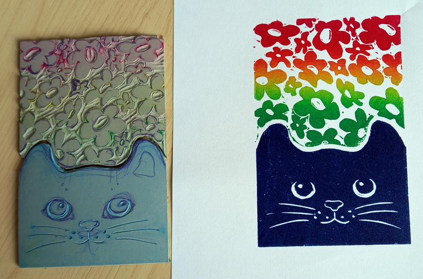 I had a bit of fun with this little lino block. I teach art to adults a couple of days a week and I’m running a course on lino printing at the moment. We’re doing ‘jigsaw’ lino blocks, and today I demonstrated how to maximise colour using the ‘rainbow roll’ technique. It’s nice to do something whimsical once in a while.