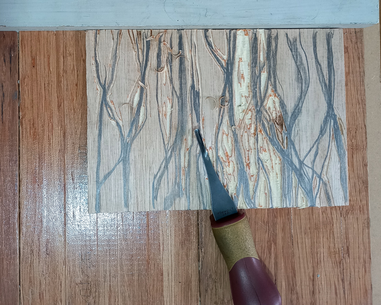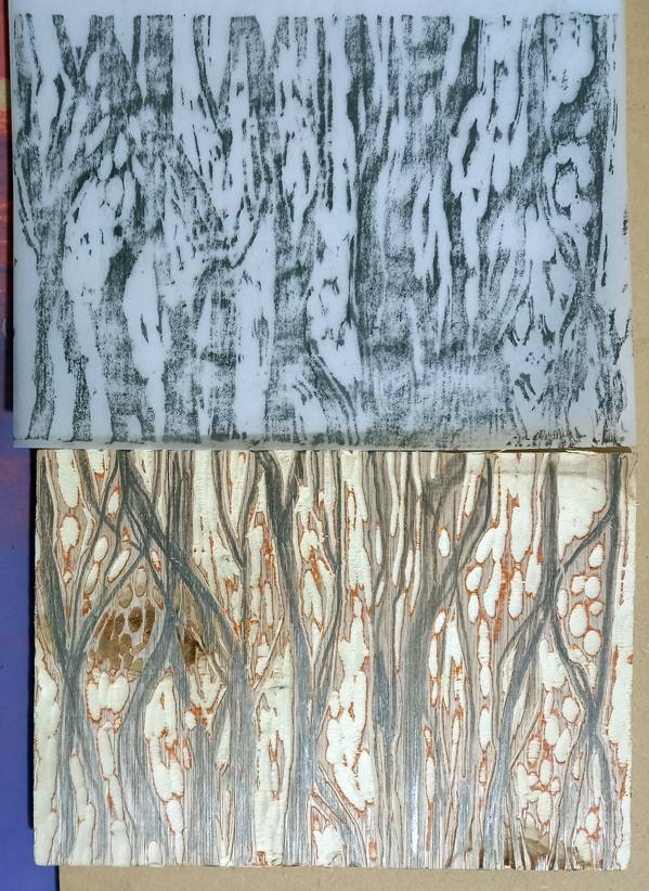 Just doing a quick check on the carving so far, using good quality tracing paper and a block of graphite. It’s a bit rough and ready but gives me an idea about how much cutting I need to do on this woodblock. I started carving it as a demonstration piece on an adult education session I was running recently, and I’m going to finish it over the next week or so, printing it up using different techniques.