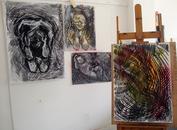 Getting into some serious drawing lately, using fairly large discarded prints because the paper is good quality, usually Somerset or Bockingford, along with charcoal, compressed charcoal, chalk and transparent oil bar. I worked up this large [A1] drawing from a tiny life drawing in my sketchbook. I covered the paper with loads of random scribblings before starting to shape the image within it. It’s one of the ones on my wall for the Grand Opening of the Mansel Street Studios this coming Friday. If you’re in Swansea between 7 and 9.30 pm, be sure to come up and see my etchings 🙂 . The main stairwell and corridors have been filled with an exhibition of work from the two groups of Elysium studio artists, there’ll be wine and nibbles in the exhibition and I’m serving cake and mocktails at my studio. Would be lovely to see you.