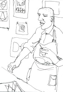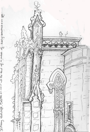 Queen Elizabeth the First described it as “the fairest, goodliest, and most famous parish church in England” and it has close associations with the tragic Thomas Chatterton, the poet Samuel Taylor Coleridge and the brilliant artist William Hogarth, who painted a triptych for the church, removed in Victorian times and now stored in St. Nicholas Church in Bristol. I sat in the grounds during Evensong and made this sketch in my ‘origami’ sketchbook, using Faber Castell Pitt drawing pens. The building is festooned with magnificent medieval carvings and there is a huge amount of variation. Grotesque gargoyle heads jostle with the sculpted features of ordinary folk on windows and turrets. I only had time to draw a tiny fraction of the magnificent building but I must go back and take a look at the Gothic interior and track down the Hogarth triptych sometime.