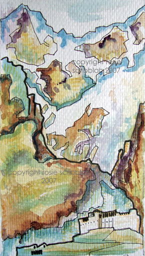 We visited friends in Copenhagen last winter – lovely city – amazing towers everywhere. We climbed one of them – The Church of our Saviour, a twisty one that went up 300 feet or so. Not a good idea, not a good idea at all when you’re terrified of heights! I’d intended to draw from the top, but ended up clutching the wall and handrail, whimpering in terror while small children skipped merrily past, oblivious to the hideous life threatening danger. I stayed at ground level from then on.