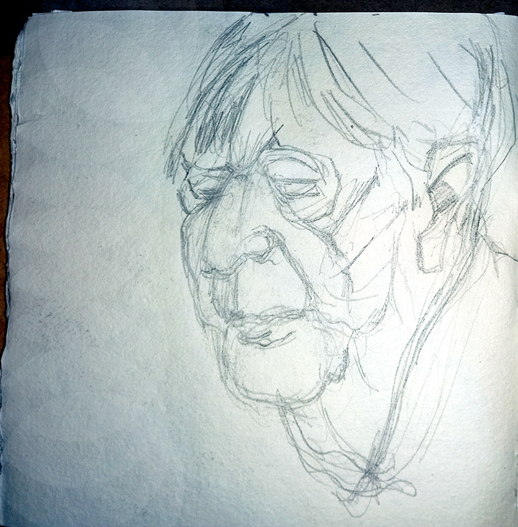 Another head of a performer from the Riverside Folk Club a couple of weeks ago. It’s an eclectic mix of music, folk and country, blues and bluegrass, the occasional small choir and even a bit of comedic verse. I drew this with a 2B graphite block into a Khadi sketchbook.