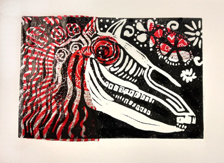 I think the sketch is quite funny, about as jolly as a horse skull can be, but the monotype is much more sinister. The chine collé is paper made from recycled saris and it’s very fibrous.