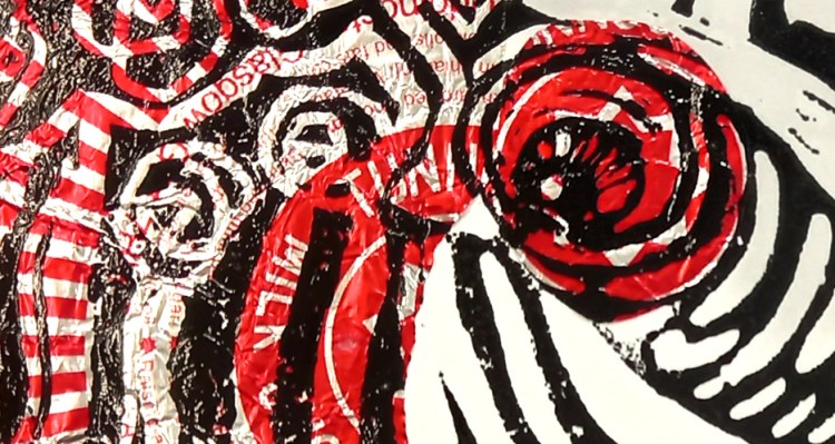 A Happy New Year to you. Blwyddyn Newydd Dda i chi. Here’s my latest Mari Lwyd, a linocut with chine collé using the foil wrapping of the very popular (in the UK) Tunnock’s Tea Cakes. I like the way the stripes of the foil interact with the stripeyness of Mari’s ribbons. She’s a little early, as her night is January 13th, Hen Galan, but that’s a Welsh tradition so I’m using her to greet the world today, according to the modern calendar 😀