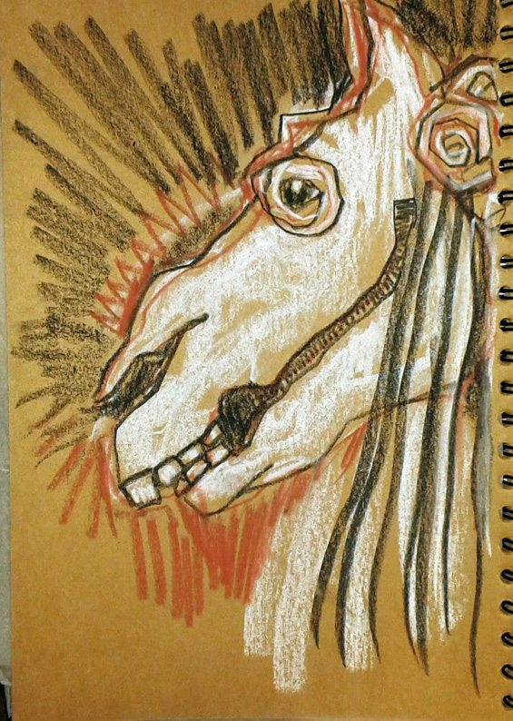 We’re at that time of year when the old Welsh tradition of The Mari Lwyd / Y Fari Lwyd, is awakening from her slumbers ready for her night, Hen Galan, a month away early in the New Year. I’m going to post my archive Mari Lwyds throughout December and early January to get us all in the mood. Here’s one who visited Gellionen Chapel six years ago – back in the days before Covid19. I drew her in black, sanguine and white conte crayon into a brown paper sketchbook.