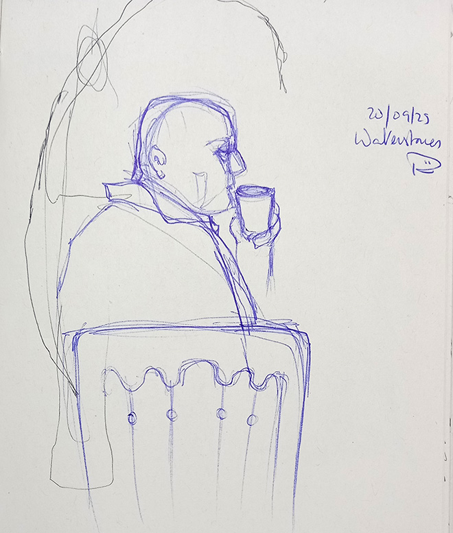 I scribbled this in Waterstone’s café the other day. I liked the signage on the wall and the chap taking tea beneath it. I started to draw his companion, but they upped and left. How rude!