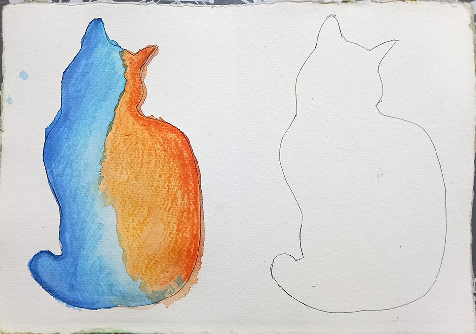I carried on playing with some Derwent Aquatone watercolour sticks that I was given a while back. I did a blend of Prussian Blue, Ultramarine and Light Blue a couple of weeks ago and today worked in some Spectrum Orange and Middle Chrome. The cat shapes are from a stencil I cut of our little Bill the rescue cat.