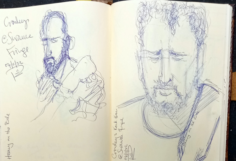 My three-night stint as a Swansea Fringe artist yielded 30 sketches …. and a lot of aches! I was hunched over my sketchbooks for about 4 hours each evening and my body wasn’t too happy. But I LOVED it. Drawing and listening to rock and metal – like I’d died and gone to rock heaven! Here are two sketches of “Heavy On The Ride”. They’re fab … listen to them here ….