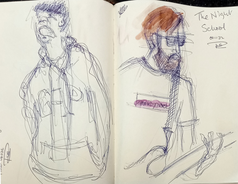 It’s been just over a week now since my three-night stint as a Swansea Fringe sketcher. It was a great idea and seemed to go down well with the bands. I’m well happy, I did 30 sketches, a lot of work in a relatively short time. And loads of really good practice too. Drawing and listening to rock and metal – living my best life! Here are two musicians from a cracking local band, Swanhill. I loved their set. Check them out here.
