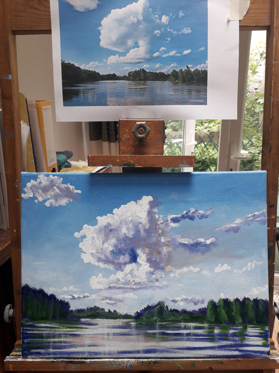 I did a bit more work on the sky painting I started yesterday at Ed Sumner’s online “Cheese and Wine Painting Club“. I think I’ll have to do a bit more faffing; a couple of the smaller clouds are too dark and there’s more to be done on the reflections of the clouds in theContinue reading “Nearly Finished The Sky”