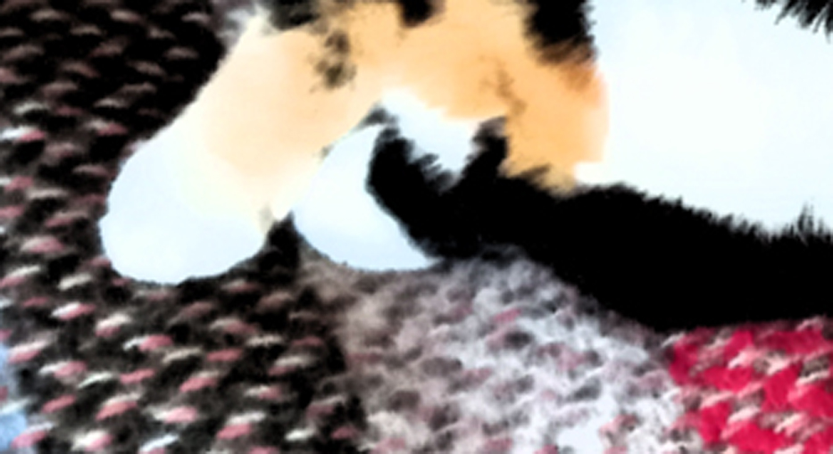 A digitally enhanced photograph of a fluffy calico cat with white socks lounging on a striped woven woollen blanket.