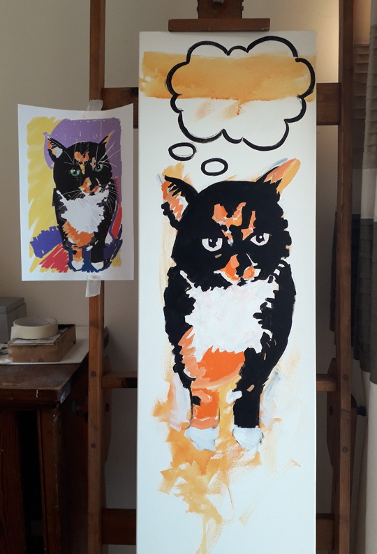 I did a bit more work on my Pop painting of Sparta Puss this afternoon, on the speech bubble, her coloured bits and her eyes, which are a lovely green. I started filling in the background with left over paint – waste not want not – but I haven’t decided what to put in itContinue reading “Cat’s Eyes”